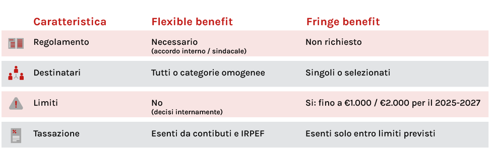 I fringe benefit sono compensi in natura diretti, spesso con limiti fiscali (es. €1.000/2.000); i flexible benefit richiedono regolamenti interni o accordi sindacali, sono destinati a categorie e non hanno un limite prefissato per legge.